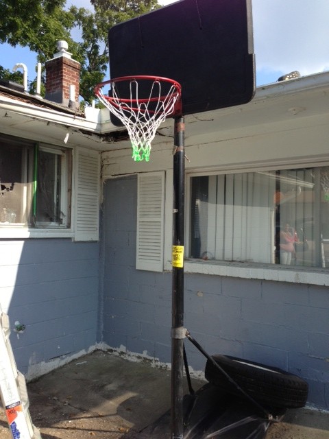 David Esrati hangs basketball nets as part of his election campaign.