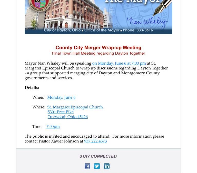An email on official City of Dayton letterhead from Nan Whaley to a public political meeting about the defunct regionalization meeting