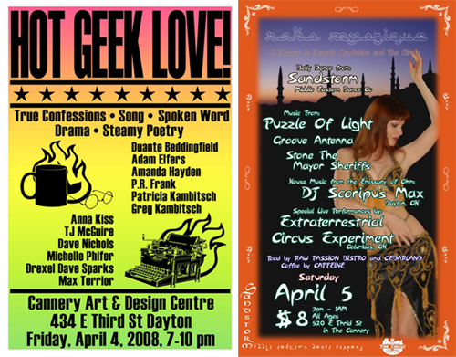 Saturday night, in the same tradition, you can continue with the arts set with “Raks Mystique” at the Cannery, 520 E Third St- from 1pm to 1am for $8- It’s put on by the Dayton Circus. They’ll have Puzzle of Light playing and belly dancers from Sandstorm.