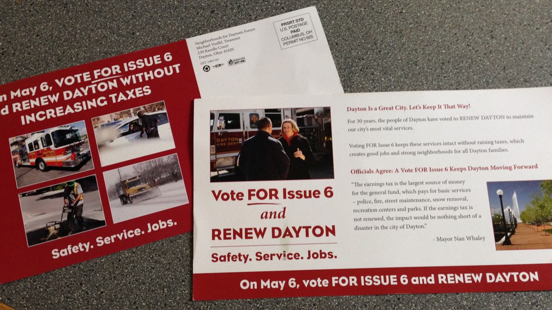Mailer sent to Dayton Households with Mayor Nan Whaley leading the lie to “renew” a tax that is in fact a vote to make it permanent.