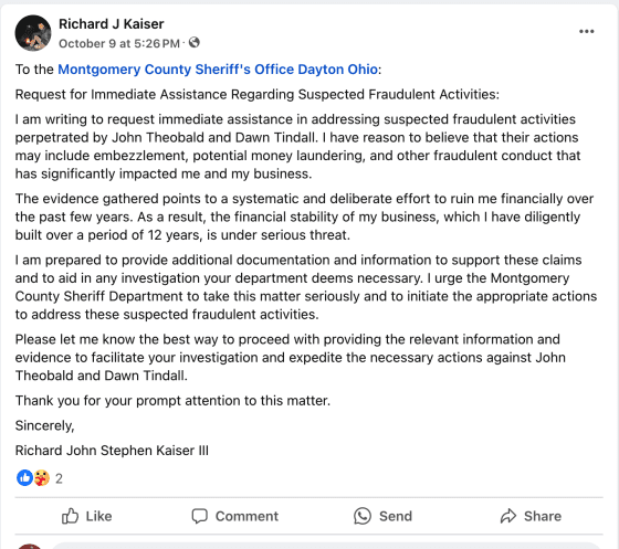 As I always say, wait until election day to vote, you never know what may come up the day before. Kaiser made an appeal to the Montgomery County Sheriff’s Department on Facebook weeks ago- that he had the goods on his former partner, Debbie’s treasurer: