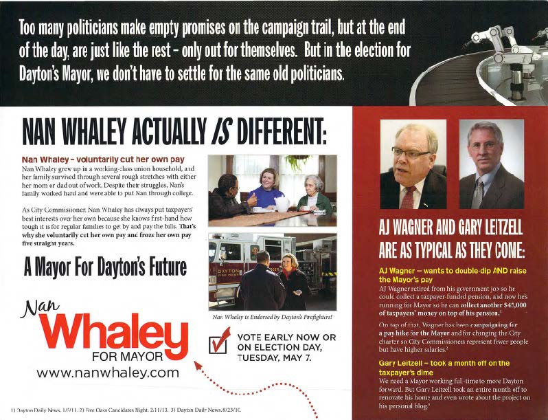 Nan Whaley is the most political animal in local Dayton politics. Her obscene campaign contributions, push poll and now, this negative campaign piece should tell Dayton voters all they need to know about Ms. Whaley- she’s only out for herself.