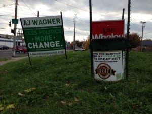 Esrati trash can cost less than the signs behind at Keowee and 35 Exit ramp