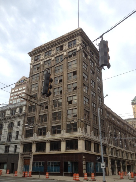 Photo by David Esrati, the SW corner of the Arcade complex, with windows falling out.