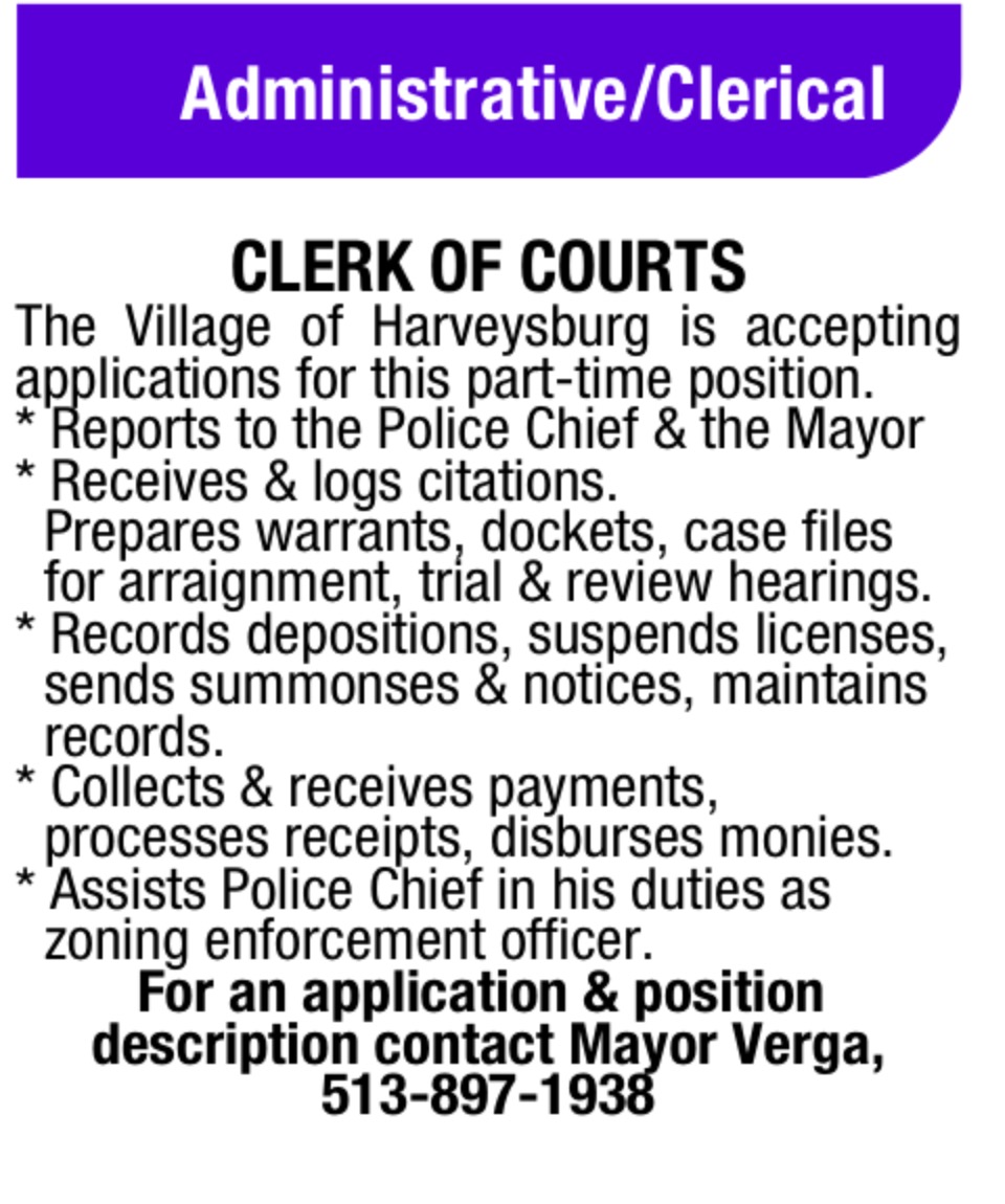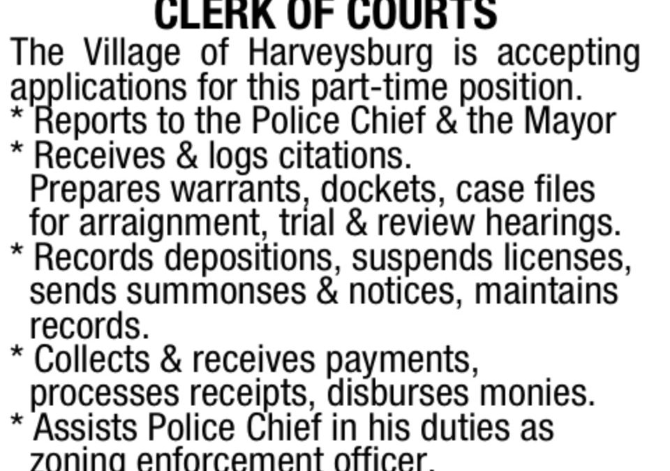 Ad for Harveysburg clerk of courts