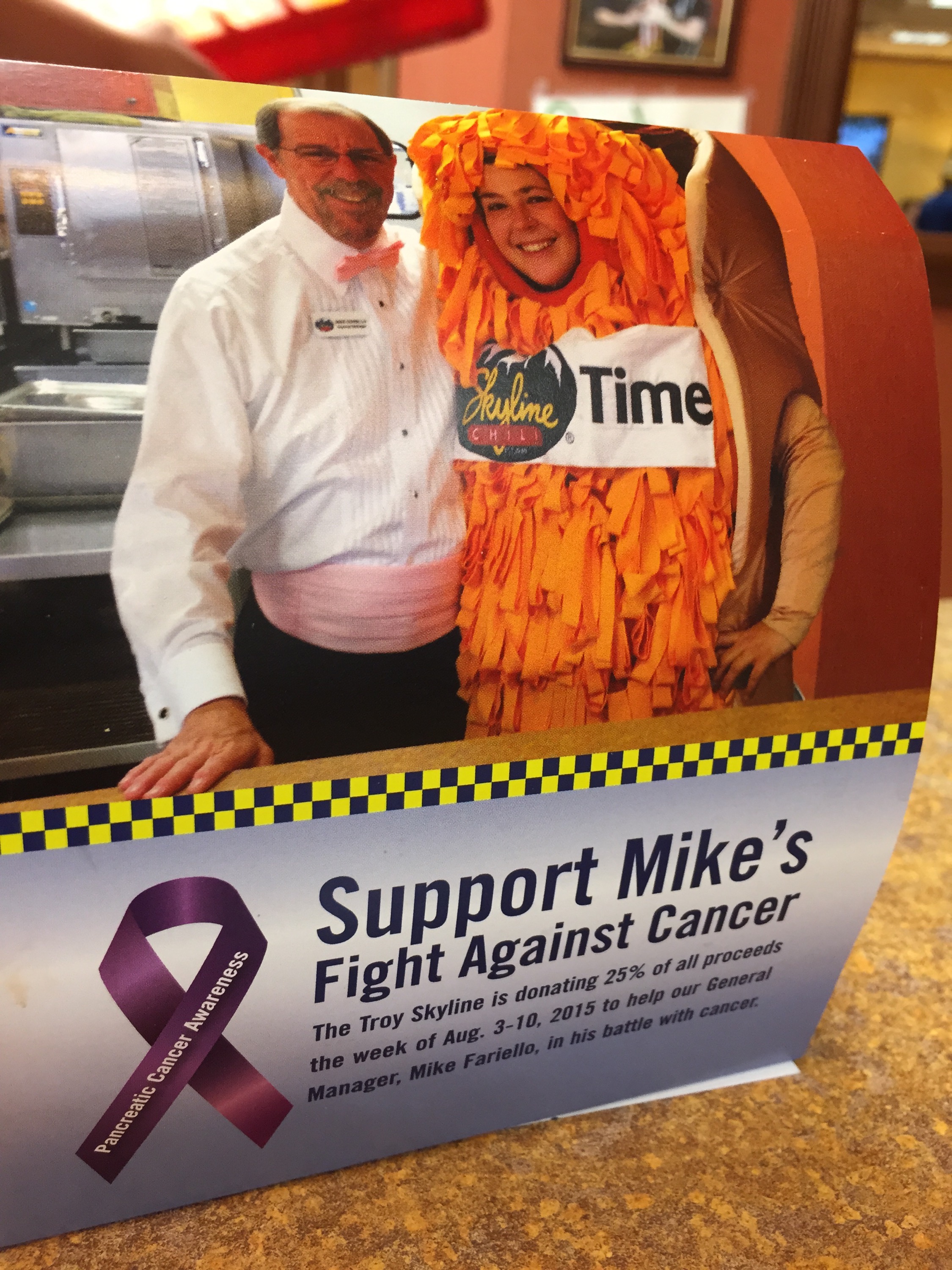 “Mike Fariello as many of you know has stage 4 pancreatic cancer that has spread to his liver. We are holding a week-long fund raiser for Mike’s medical bills, etc. We are donating 25% of our total sales from Monday, August 3, through the following Sunday to help alleviate any financial stress Mike and his wife Kathy are under. Please come in as often as you can. Remember it began yesterday and continues until Sunday. Laura Davie from AlterEgo face painting will be there Monday through Friday lunch from 12-2. She will be donating what she makes to Mike as well.”