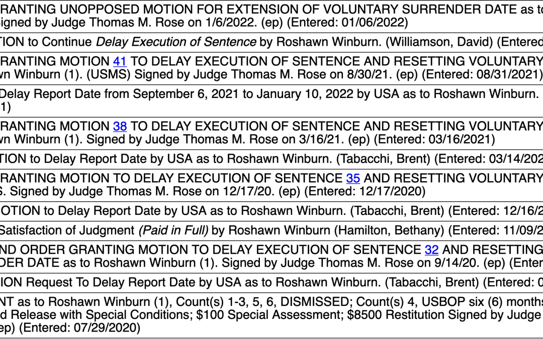 Judge Thomas M Rose docket entires delaying Roshawn Winburn’s prison date