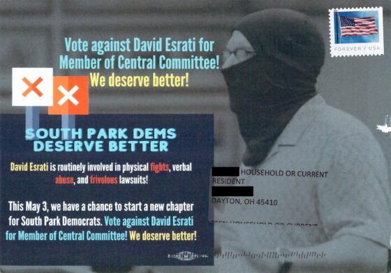 This May 3, we have a chance to start a new chapter for South Park Democrats. Vote against David Esrati for Member of Central Committee! We deserve better! Union label.