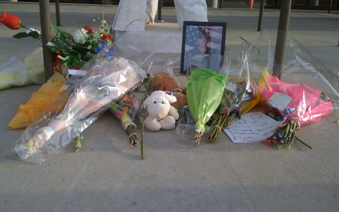 Jesse Huff ended his life next to this monument at the Dayton VA medical center on Friday, April 16, 2010. This photo was taken by David Esrati on Tuesday, 20 April 2010 of the memorial that’s been made by others.
