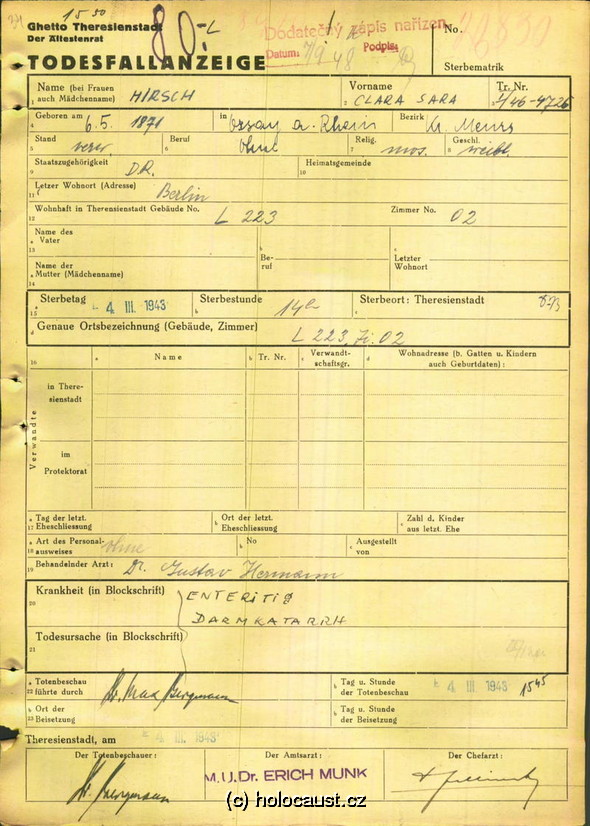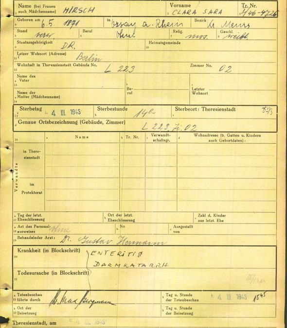 From the Czech Archives: https://www.holocaust.cz/en/victims/PERSON.ITI.419836 The death Certificate of Clara Hirsch, my Great Grandmother